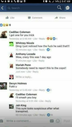 A majority of the public on Social media that have taken an interest into the case and the shooting incident, opine that the shooting was a set-up. The day before the Facebook livesteam of the incident in which Holmes was shot, he and the second man, Johnathan "Cadillac" Coleman, in the vehicle had made threats against one another on their social media profiles.