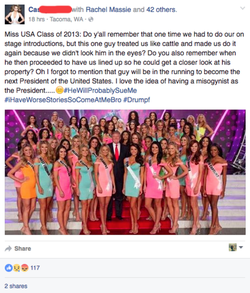 In the comments section of her original post, she claims Trump groped her and tried to seduce her, kept grabbing her Buttocks, and invited her to his hotel room.