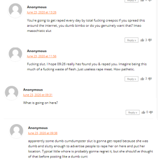 Many users referred to her as terms such as "cumdumpster", "dumb whore", "worthless rape meat", etc, and told her to "gain some dignity".