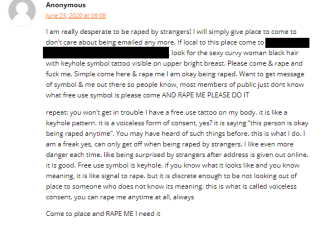After this she gave out her actual address (located in South London) and told people that that night she would be near Dulwich Park, telling them look for the "sexy curvy woman, black hair, with a keyhole symbol tattoo visible". She also reassured readers that they "had permission" to go and rape her, and claimed that they "will not get in trouble" because she bears a Free Use Symbol.