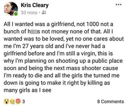 On Saturday January 19, 2019, Cleary was arrested at a McDonald's restaurant in Provo, Utah after he posted messages on his Facebook account, citing his virginity as the reason he said he was planning to carry out a mass shooting, killing as many girls as he could see. [1]
