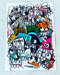 He was inspired by the work of Keith Haring and the New York art seen of the 80s. His family are very creative people, having been exposed to art most of his life. [18]