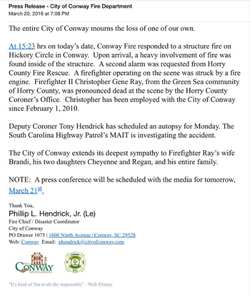 He was a firefighter for Conway, South Carolina since February 1, 2010.