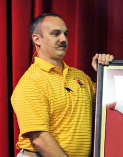 Photo of Christopher Hixon being presented an award for his excellence.