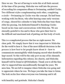 “After his passing, Jon dedicated himself to finishing Circles based on his time and conversations with Malcolm,” “We are so grateful to Jon and to those who gave their best to the difficult and emotional task of putting out this body of work.”