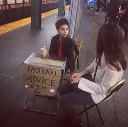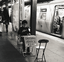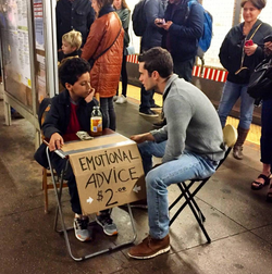 In October of 2016, Ortiz started setting up a table and a chair offering "Emotional Advice" at Bedford L train stop in Brooklyn.