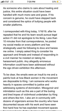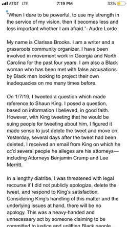 On January 7th, 2019, Brooks asked Shaun King a question over his fundraising efforts. She deleted the tweet over fear of being sued. Several days later, she received an email from King and his lawyers threatening legal action if she did not publicly apologize. Brooks asked King to reconsider his approach but King responded by doxxing and harassing her. Brooks has started the #ISupportClarissa hashtag to raise awareness of her situation. [4]