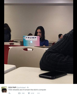 Clifford Durand is a student at St. John's University. In February 2016, Clifford was suspended from Twitter for tweeting "7000 retweets and I'll smash this bitch's computer"[666666] along with a photo of classmate Brianna Algazali's computer, which had a Donald Trump sticker. Brianna found out about the tweet and there was an altercation after class. [undefined] Clifford does not seem to have been punished by the university for his tweet. [undefined]