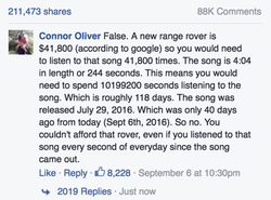 "False. A new Range Rover is $41,800 [6](according to Google) so you would need to listen to that song 41,800 times. The song is 4:04 in length or 244 seconds. This means you would need to spend 10199200 seconds listening to the song. Which is roughly 118 days. The song was released July 29, 2016. Which was only 40 days ago from today (Sept 6th, 2016). So no. You couldn't afford that rover, even if you listened to that song every second of everyday since the song came out."