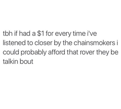 "If I had a $1 for evertime I've heard listed to closer by the Chainsmokers, I could probably afford that Rover they be talkin' bout"