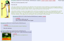Kek is depicted in male form as a man with a frog head and in female form as a woman with a snake head, and is represented "as a symbol of darkness, Kuk also represented obscurity and the unknown, and thus chaos."