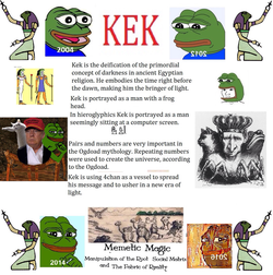 The theory goes that Kek used 4chan as a medium to channel energy from its millions of users to bring forth a golden age since "Kek was seen as that which occurred before light, thus was known as the bringer-in of light."