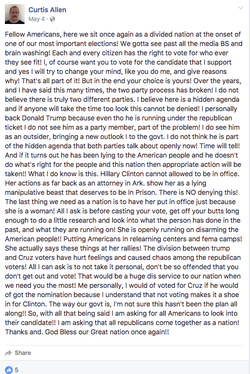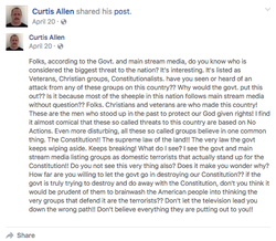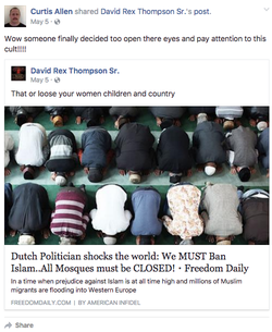 Allen’s Facebook page is filled with anti-Muslim and anti-Immigration rhetoric, a lengthy post explaining why he is supporting Donald Trump for president, and anti Barack Obama memes. [1]