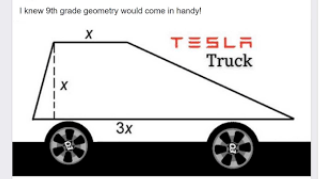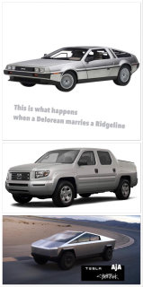 The original design concept for a Tesla Semi was released in 2017 and looked more a super-sized pick-up truck. It was originally touted as a truck that could fit another truck in its truckbed. The driver's seat was uniquely structured like a futuristic shuttle's cockpit. Critics created the "What it actually looks like" meme to emphasize how outlandish the 2019 Cybertruck is. Another meme described it as a mix between a Delorean and a Ridgeline. [8][9]