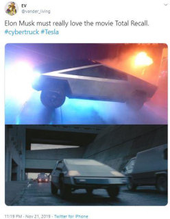 Tesla was always up front about how the vehicle design was inspired by Blade Runner. That didn't keep people from juxtaposing the two and marveling at how science-fiction can easily become reality. Other people have pointed out that it looks like a car that was briefly shown in the 1990 film, Total Recall. [14][18]