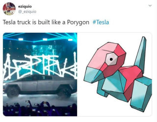 The angular frame looks pixellated to some and has inspired many video game memes. The most popular one points out how the Cybertrucks trapezoidal nose looks extremely similar to Lara Croft's rack in the early Tomb Raider series. Someone even did the math and found that the Cybertruck has 103 polygons, 225 edges and 124 vertices. [10][11][12]