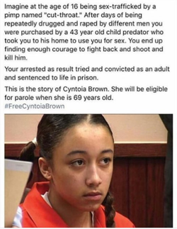 Imagine at the age of 16 being sex-trafficked by a pimp named "cut-throat." After days of being repeatedly drugged and raped by different men you were purchased by a 43 year old child predator who took you to his home to use you for sex. You end up finding enough courage to fight back and shoot and kill him. Your arrested as result tried and convicted as an adult and sentenced to life in prison. This is the story of Cyntoia Brown. She will be eligible for parole when she is 69 years old. #FreeCyntoiaBrown*