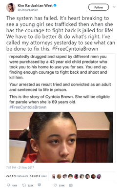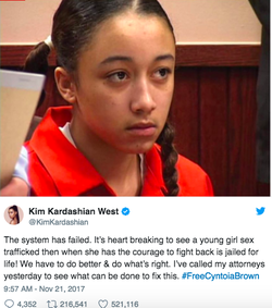 Many of these posts have used the hashtag ***#***FreeCyntoiaBrown ** been shared by celebrities, including LeBron James, Snoop Dogg, Cara Delevingne, and Kim Kardashian. [19] Kardashian tweeted that she contacted her lawyers to see what can be done. [16] [17]