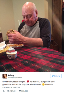Kelsey Harmon stated for the caption of the photo that she was the only one that joined him who cooked 12 burgers for his six grandchildren.