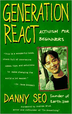 In 1997, at age 20, Danny Seo published his first book, Generation React: Activism for Beginners. He discusses his experiences with growing his first nonprofit, Earth 2000. It contains a step-by-step guide meant to teach the reader how to change the world with practical skills and examples. [31]