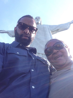 Photo of David Bailey and his mom in front of the Christ the Redeemer (statue) in Brazil