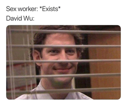 Citation Linkywqaugeunhowzrcj.public.blob.vercel-storage.comA meme of Jim from The Office portraying David Wu's actions
