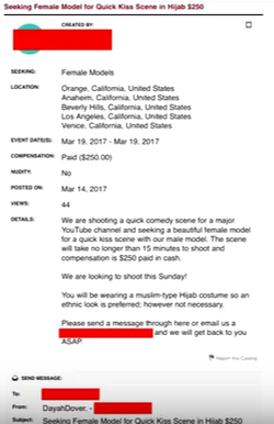According to Dover, she was on Model Mayhem, which she uses for castings when she travels internationally and out of state. She took a look at the casting calls and noticed an ad posted by someone she thought was a "talent director" named "Jennifer Collins." The ad stated, "Seeking Female Model for Quick Kiss Scene in Hijab $250."