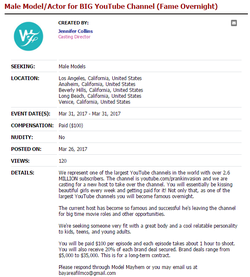 Screenshot of Prank Invasion's casting call for which Dayah Dover applied (scheduled for March 19, 2017)