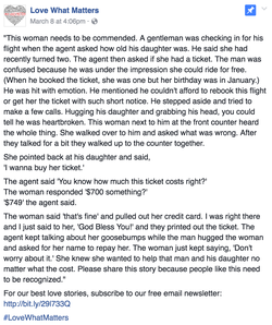 On Wednesday, the 8th of March, 2017, Debbie was coming back from a flight from Omaha, Nebraska when she saw a man in distressed after he had spoken with the agent. It turns out that his daughter had turned two years old since the time that he had bought his own ticket. Debbie then walked over to the man and asked him what was wrong. She then headed over the agent and asked to buy the girl's plane ticket. She took out her credit card and purchased the ticket. *