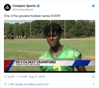 De'Coldest Crawford attends Green Oaks High School and plays on the football team. In his freshman year he was able to run 200 yards with 3 touchdowns. In his 2019 sophomore year he was able to smash his previous season's numbers with an impressive 30 catches for 691 yards and 6 touchdowns-in only eight games![14]