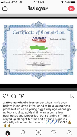 According to a post on Facebook and Instagram post from January 2018 Dedrick Williams received a Certificate of Completion from the American Safety Council after finishing a 3-hour tattoo education course on blood borne pathogens and communicable diseases. Dedrick Williams also claimed to be a licensed tattoo artist.