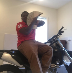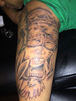 Dedrick Williams wearing his tattoo artist uniform labeled “Tattooman Chucky” and “Zombiez Ink"
