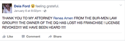 In January 2017, the owner of Zion Dairy Queen, a white man named Jim Crichton, called Deianeira a nigger. He admitted to police having used the word, and said that he was fed up with black people. Crichton used the slur after Ford told him her order hadn’t been filled correctly, and that she would like a refund. She was with her children.