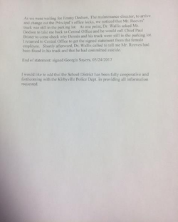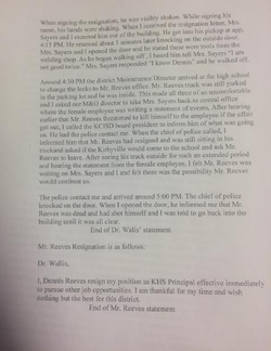 "On 5/23/2017 Georgia Sayers [assistant superintendent] and I met with an employee of KCISD who claimed to have had an affair with Mr. Dennis Reeves, KHS principal while she was his secretary.