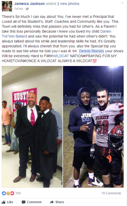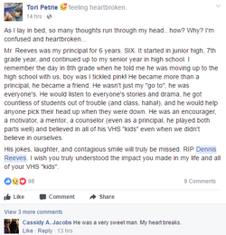 Dennis Reeves (1972-May 23, 2017) was the principal of Kirbyville High School (KHS) in Kirbyville, Texas. He was married father of two. He was known by both students and their parents as a great principal, who always worked help to help and listen to them.