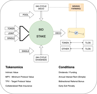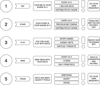 BID The Bid and Stake contract is deployed at Stage I and is a single module with various usecases. Based upon it's configurable parameters it can be used for Funding or DeFi Gamification. This entry layer of the Bid & Stake contract will release 1,000,000 DECO every day and these will be distributed on all the bidders regardless of the token used for bidding. During each individual cycle, the value of the bidding tokens referenced by USD will be added to the MPV - Minimum Protocol Value and used for reference to TPV and Market Values of DECO for arbitrage purposes. The TPV is calculated from the other end of the Stage II contract, based upon a target value of REES, our second token and will be fixed to make arbitrage valid. The concept is the same as for other DeFi protocols where one of the utility tokens has a fixed price in a Lending / Borrowing scenario. When the layer is fully developed, projects or dApps may whitelist their token and set individual configuration parameters through an MSIG - Multi Signature Group, solely for that singleton. Another interesting concept that will develop from this entry layer is the collateral value of multiple tokens backing up DECO, hence reducing the risk of Black Swan for later usecases for REES. Tokens that are whitelisted in this layer will automatically get access to various modules such as the Social Media module.