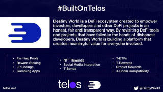 Destiny World has partnered with Fortis another project running on Telos for fiat-onramps and payment systems as well as developing joint usecases for tangible financial instruments running the core features on blockchain technology.