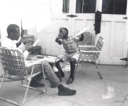 Photo from December 1964, of Donald Osborne (age 9) celebrating after finishing a Lotus 29 model car with his older brother, Art Osborne.