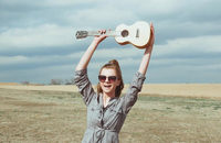 Photo of Elise Ecklund holding her Ukulele above her head near some plain fields.