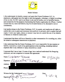 签名者,我,特此同意Future Freshman LLC公司的员工,和代理人,于2011年7月18日,对我有权进行拍照,录像,或数码录音,并在现在或未来将此用于所有媒体,以专门用于为iPhone上推广Picabood 的目的。 [46]