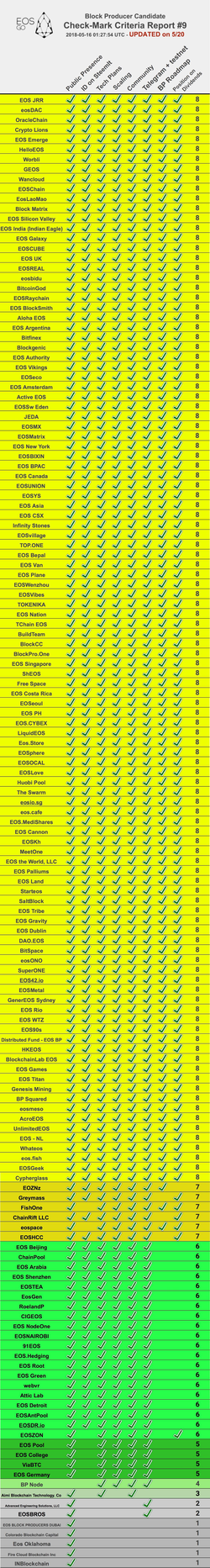 The list has been categorized (and then alphabetized) based on the number of check-marked criteria confirmed by EOS Go. [undefined]