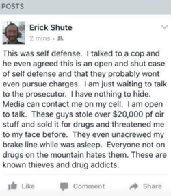 Shute claimed in a Facebook post that the shooting was in self defense and that the people he shot tried to rob him of $20,000. He also claims that they were drug addicts. According to the post he also contacted the police about it and they were ok with what he did.