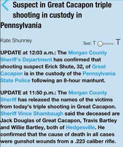 Shute is alleged to have shot and killed 3 people in Morgan County, West Virginia on June 13, 2016.