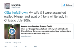 On Saturday, July 30th, 2016, Ernest and Cassie attended the "Chicago Margarita Fest" when they had encounter with Jessica Lynn Sanders who lashed her racist tongue at them for picking up a bean bag that she and her friends were not using.