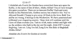 "I Abdallah adu Everitt ibn Gordon have committed these acts upon the Kuffar, in the name of Dar al Islam, Allahu Akbar ! You all have brought this upon yourselves. There is no innocent Kuffar! Each and every Kuffar in this Nationalistic, Godless society has a hand in this. You’ve allowed Donald J Trump to give away Al Quds to the Jews. Both You and he are wrong, it belongs to the Muslemeen. We have penetrated and infiltrated your disgusting country. These Acts will continue until the Lions of Islam overtake you. Turn to Allah, make tawbah and fight with us, the soldiers who fight in the day and the night. Allah SWT is most forgiving, I am not. Long live ISIL, Long Live Abu Bakr al-Baghdadi. Allahu Akbar! Abdallah abu Everitt ibn Gordon al-Amriki." [0]