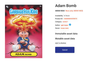 On May 12th, 2020 Topps and WAX released their first series of Garbage Pail Kids NFTs through a special shop designed specifically for the cards, https://toppsgpk.io/shop. [3] A total of 12,000 GPK card packs containing 110,000 cards sold out in 28 hours. Within a week, over $280,000 worth of GBK NFTs had been traded on the secondary market and certain cards already began selling for a high price, like the super rare animated Adam Bomb which sold for $1,160 or around 25,000 WAX. [4]