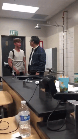 Gideon Yapp (left) yelling at physics teacher Franklin Hsu (right).