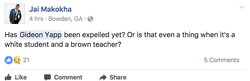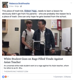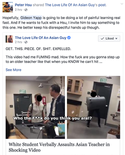 On May 25, 2017, during the middle of a school day, there was a provocation between Gideon Yapp and his physics teacher Franklin Hsu. Both had stepped outside to talk when a student begins video recording them reentering the classroom.