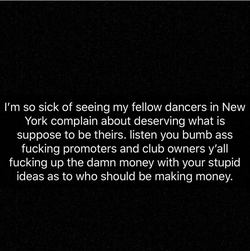 and many of her other colleagues in the New York City Stripper circuit began to message each other through social media about the difficulties they faced by trying to make a living wage as a stripper in the Queens and Bronx areas. She then made a post on Instagram about how she and other strippers are against the practices about the club promoters who have recently changed the way that the money circulates the clubs and the working areas.
