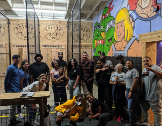 Golden Axe Co. was founded by Sean Danger in Los Angeles, California. They opened their doors on July 21st, 2019. The walls are painted with famous cartoon characters from the 80s-90s like He-Man, Transformers, and the Teenage Mutant Ninja Turtles. [1] [4]